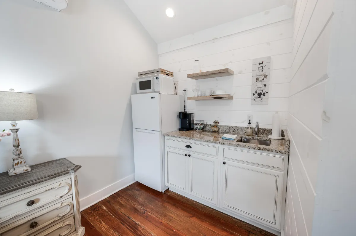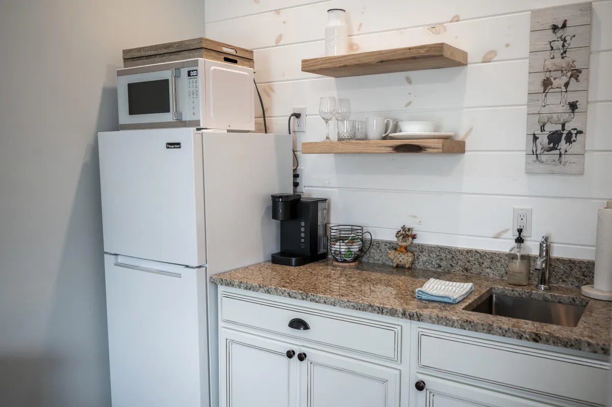Kitchenette with refrigerator, microwave, drip + Keurig coffee makers, toaster, dishes, wine glasses, and more