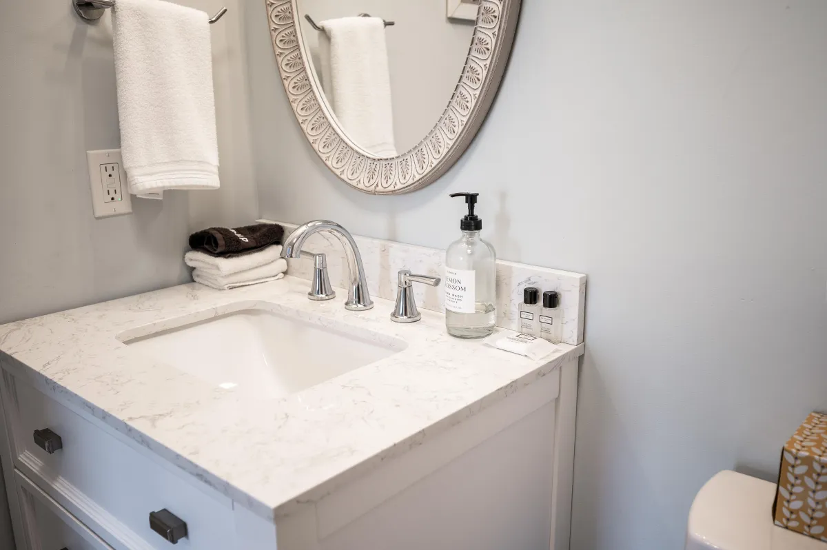 Private ensuite bathroom with hair dryer, shampoo, and fresh towels